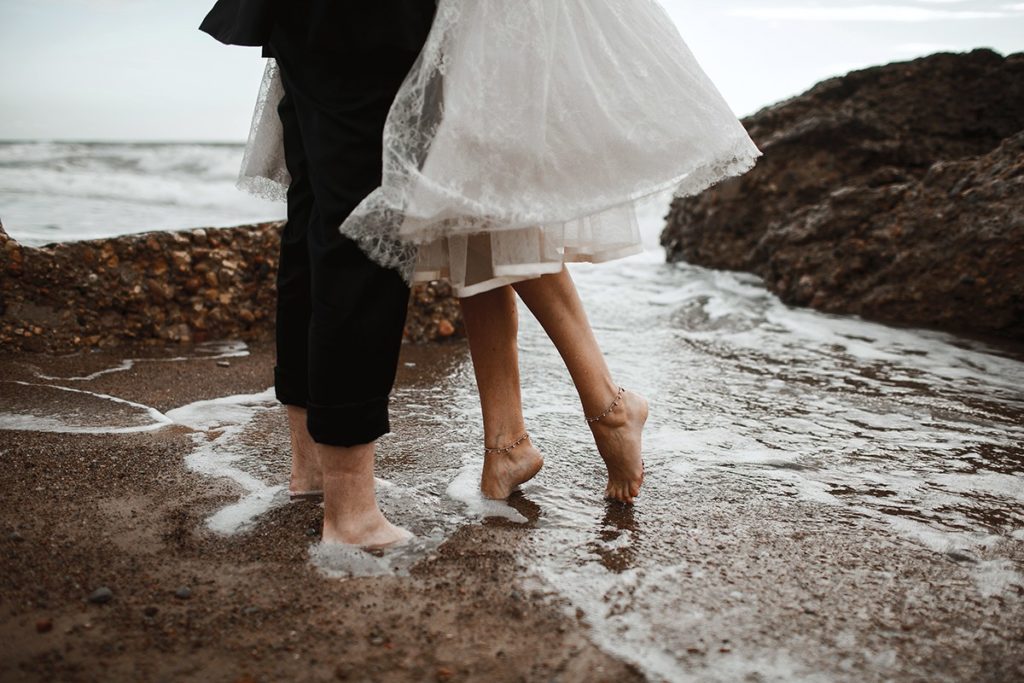 Savām mīļajām meitiņām kleitas no gaiši zila tilla es šuvu pati. Tāpat arī rotas es izvēlējos darināt pati, ar prieku apgūstot jaunas iemaņas un tehnikas. Kā viens no pirmajiem man tapa jaunās sievas kronis ar pērlēm un gliemežvākiem, bet Kasparam nolēmu sagādāt pārsteigumu pludmales ballītes daļai. Vācijā pasūtīju kvalitatīvu baltu keponu un veidoju tam rotājumus no smalkiem gliemežvākiem un pērlītēm. Ņemot vērā pludmales pasākuma specifiku, es skaidri zināju, ka uz ceremoniju došos basām kājām un rotāšu tās ar perļu kāju rotām, līdzīgas es darināju arī savām mūzām – draudzenēm,” atmiņās dalās Diāna.