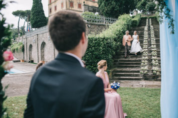 Kāzas notika jūnijā un parasti šajā laikā Itālijā ir ļoti skaisti, taču kāzu dienas rītā jaunais pāris pamodās no lietus šalkoņas trokšņa, kas kļuva arvien spēcīgāks. Stundu pirms ceremonijas tika pieņemts galīgais lēmums, ka ceremonija tomēr norisināsies ārpus telpām, kā plānots. Tas bija pareizais lēmums, jo 15 minūtes pirms ceremonijas lietus rimās un uzspīdēja saule. Kāzu ceremonija noritēja perfekti. Līgava parādījās uz skaistajām kāpnēm, viņu pavadīja tēvs, bet lejā sagaidīja mīlošs līgavainis.